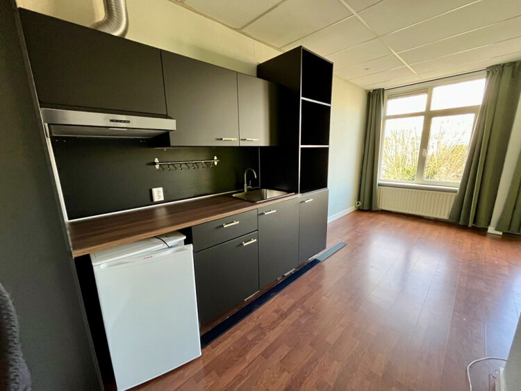 Shared entrance on ground floor with stairs to the 2nd floor. Entrance to the room with a brand new kitchen with ample storage space, 2 pit heating plate, fridge with freezer and sink. Room with large windows and laminate flooring. In the hallway is the toilet and shower.